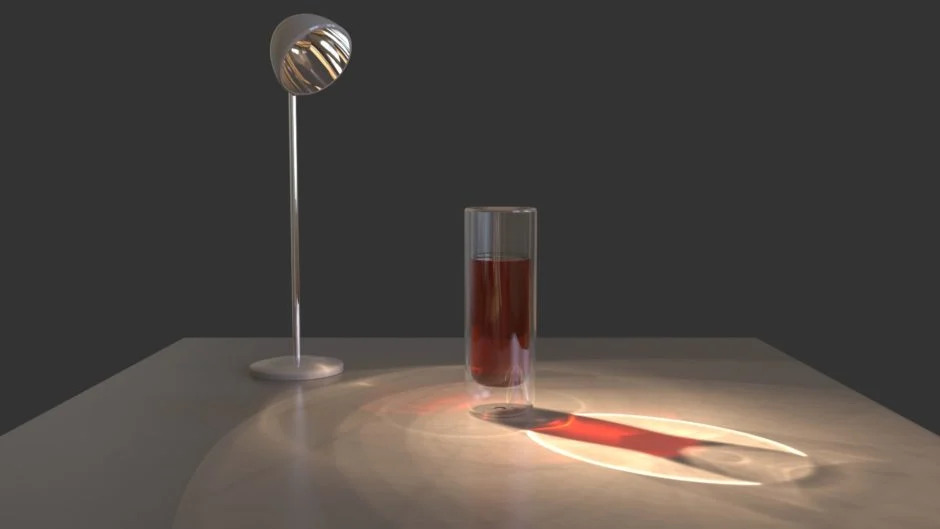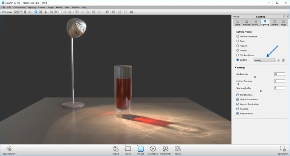 Khi bạn đã thiết lập mô hình, vật liệu, nguồn sáng và mặt đất của mình, bạn sẽ phải phụ thuộc vào Lighting Presets của KeyShot để có được kết quả cuối cùng. Đảm bảo bạn đã bật hộp kiểm Caustics trong Lighting tab trong Project window. Chế độ chiếu sáng Interior cũng được khuyến nghị để đạt được kết quả tốt nhất cho tụ quang.