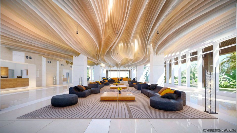 Hình ảnh nội thất sảnh dạng làn sóng được kết xuất trong Lumion 9 bởi Kamon Tangruen.