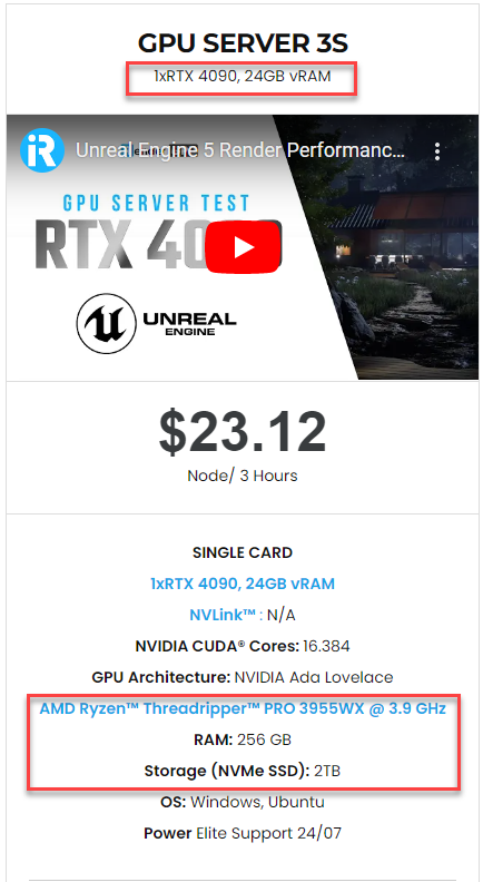 Twinmotion chủ yếu sử dụng video card để hiển thị đồ họa trên màn hình. Video card nhanh hơn sẽ cung cấp cho bạn FPS cao hơn trong chế độ xem hoặc trong trò chơi độc lập. Tại iRender, chúng tôi có một gói máy chủ RTX 4090 duy nhất phù hợp nhất cho kết xuất Twinmotion. Bạn có thể tham khảo cấu hình máy chi tiết như hình dưới đây: