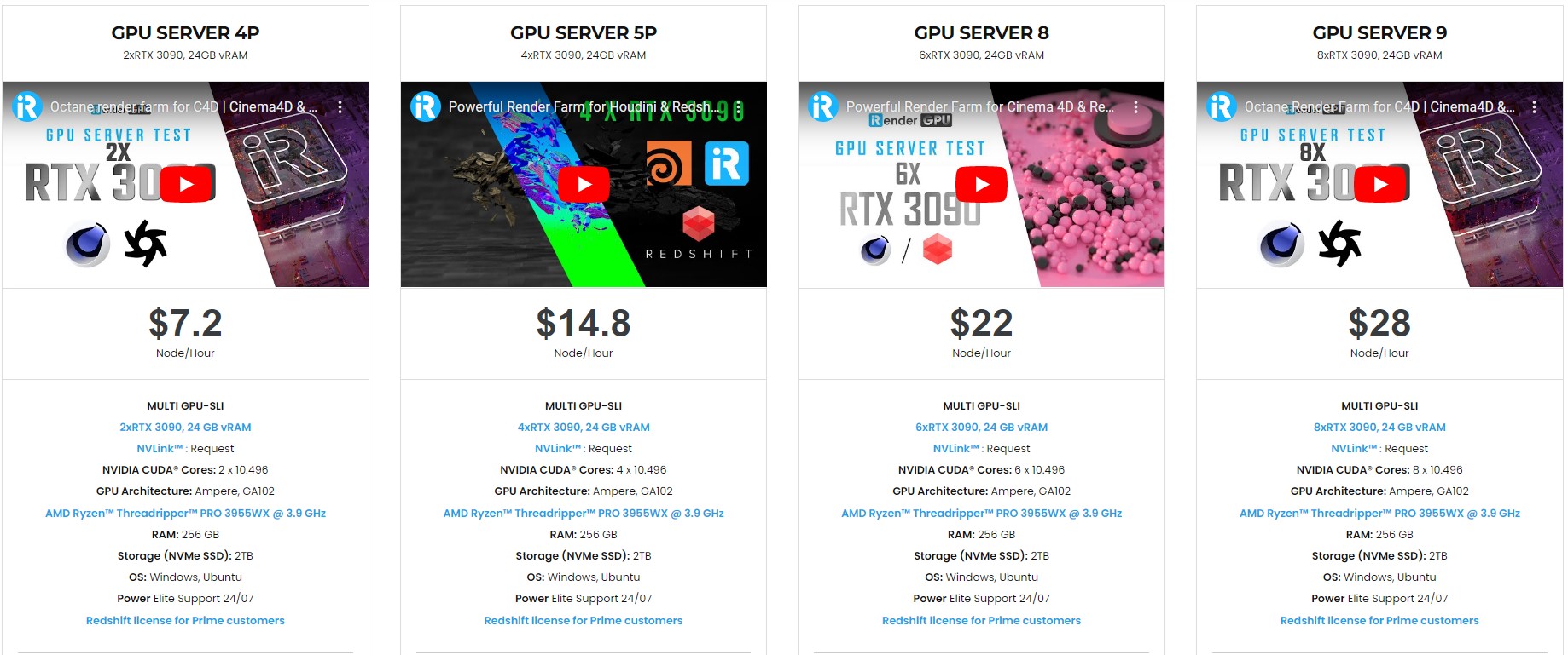 Đối với Redshift, V-Ray và Octane, chúng tôi đề xuất cho bạn gói 2/4/8x RTX3090, hoặc 2x RTX4090s. Đối với kết xuất Arnold, bạn có thể chọn gói RTX3090 đơn.