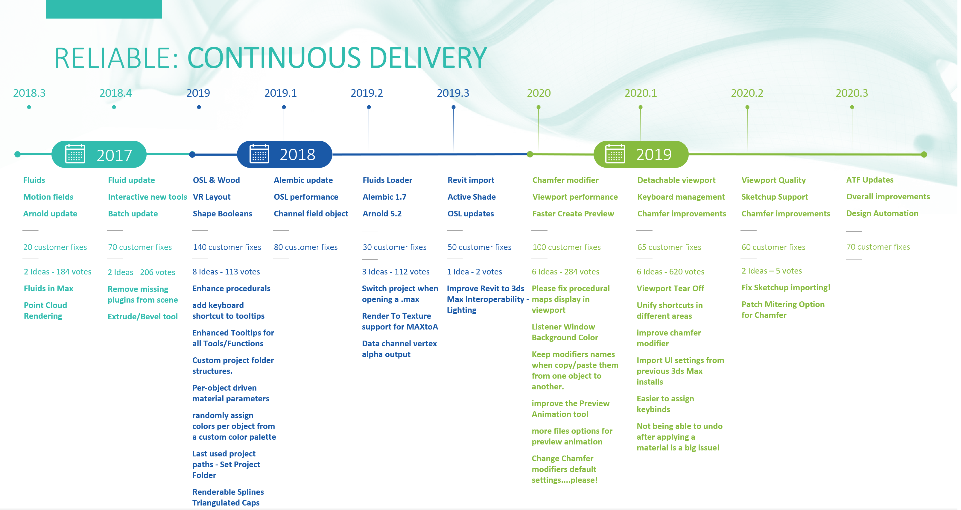 3ds Max đã điều chỉnh cách xây dựng và chuyển giao ứng dụng cho người dùng, họ có thể cung cấp nhiều giá trị hơn và thường xuyên hơn cũng như có thể tăng đáng kể chất lượng sản phẩm. Hình ảnh sau đây cho thấy một số điểm nổi bật của các phiên bản mới nhất. Lưu ý rằng các ý tưởng ở cuối hình ảnh có liên quan đến trang ý tưởng Autodesk.