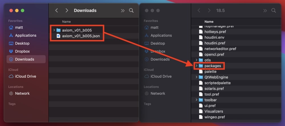 Sau khi tải xuống bộ giải, hãy giải nén các tệp và di chuyển.json và thư mục Axiom vào thư mục packages tùy chọn Houdini của bạn. Nếu thư mục packages không tồn tại, hãy tạo nó.