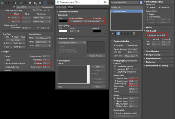 Có hai loại ánh sáng trong cảnh này: tự nhiên và nhân tạo. Đầu tiên, tôi mô phỏng ánh sáng buổi tối chỉ bằng một HDRI đơn giản, sử dụng một của Peter Guthrie ( 1957 Dusk Clear ). Tất cả các cài đặt đều mặc định và máy ảnh của tôi chỉ có một số thay đổi nhỏ. Đây là thiết lập của tôi: