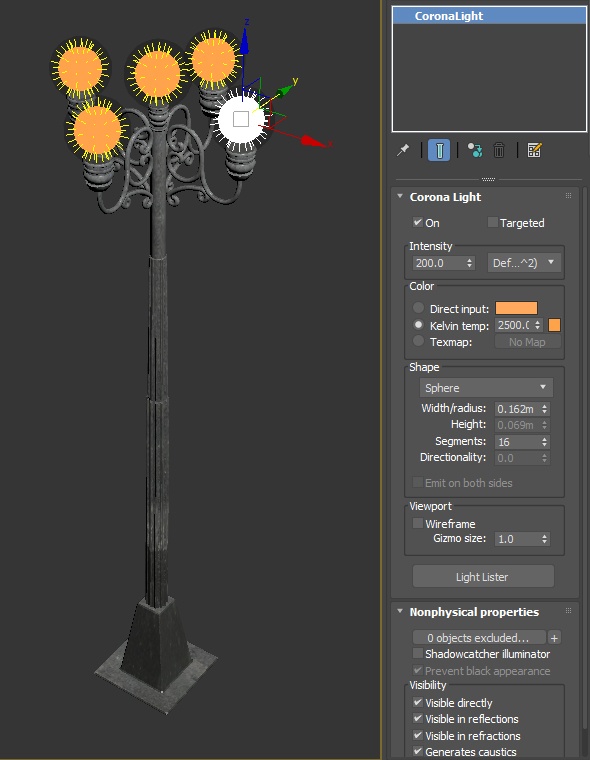 Đối với những tòa nhà ở xa hơn, tôi sử dụng một kết cấu được thêm vào một CoronaLightMtl. Nếu tôi phân phối tất cả nội thất của các tòa nhà cao tầng với hình học thực tế và Forest Pack, thì RAM máy tính của tôi sẽ không đủ! Forest Pack tiêu tốn khá nhiều bộ nhớ nên tôi chỉ muốn sử dụng nó trong các khu vực cần thiết.