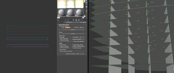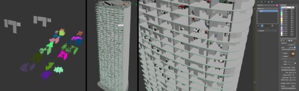 Đầu tiên, tôi tạo ra 4 khối hình chữ nhật tương ứng với 4 CoronaLightMtls với các màu khác nhau. Sau đó tôi phân phối chúng trên mỗi tầng bằng cách sử dụng Forest Pack một lần nữa. Và thêm một vài CoronaLights hình đĩa để ánh sáng bên trong sẽ có một chút ngẫu nhiên. Các tòa nhà có rất nhiều tầng, phải có sự cân bằng giữa sự lặp lại và biến thể, để có thể nắm bắt được “rhythm” của mỗi tòa nhà.