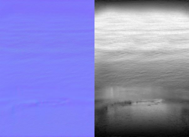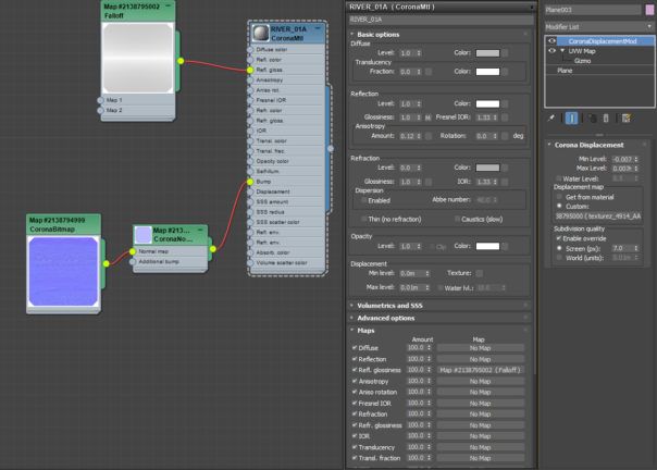 Bây giờ chúng ta cần hoàn thành phần còn lại của cảnh. Đối với nước sông, vật liệu tôi thiết lập khá đơn giản. Tôi đã tập trung rất nhiều vào kết cấu của dòng sông. Tôi pha trộn nhiều hình ảnh của các dòng sông khác nhau trong Photoshop để đưa ra bản đồ Dịch chuyển và Bản đồ thông thường, như được thấy dưới đây:
