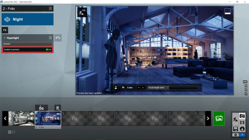 Trong Lumion 10.3, bạn cũng có thể thấy hiệu ứng Hyperlight effect ảnh hưởng đến ánh sáng trong bản xem trước chất lượng cao. Chỉ cần bật nút bật trong chế độ xem trước nút trong khi bạn sử dụng hiệu ứng hyperlight và sau đó nhấp vào scene.