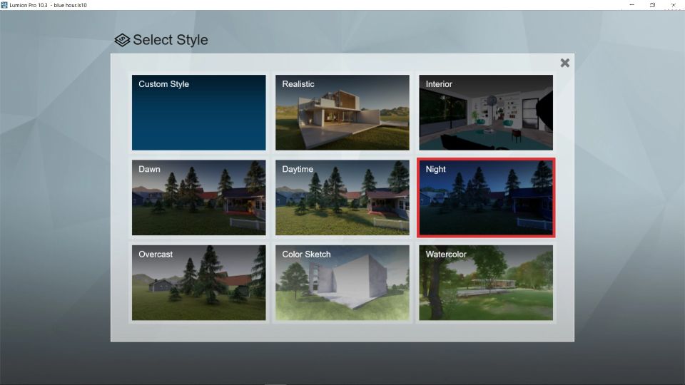 Tất cả các Lumion styles đi cùng với sự kết hợp các hiệu ứng được sắp xếp trước đó và cho bạn 1 màn hình chủ để nhanh chóng chuẩn bị giao diện kết xuất đồ họa của bạn