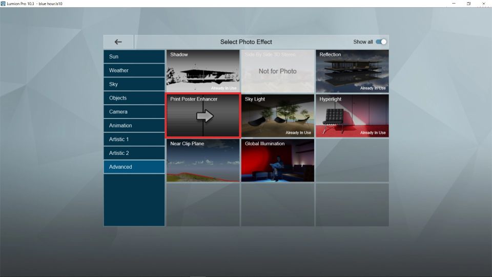 Hiệu ứng này được gọi là Print poster enhancer nằm ở mục Advanced của hiệu ứng ảnh, Đơn giản chỉ cần thêm hiệu ứng này và bạn sẵn sàng cho việc kết xuất, hãy nhớ rằng hiệu ứng này sẽ làm giảm số lần kết xuất.