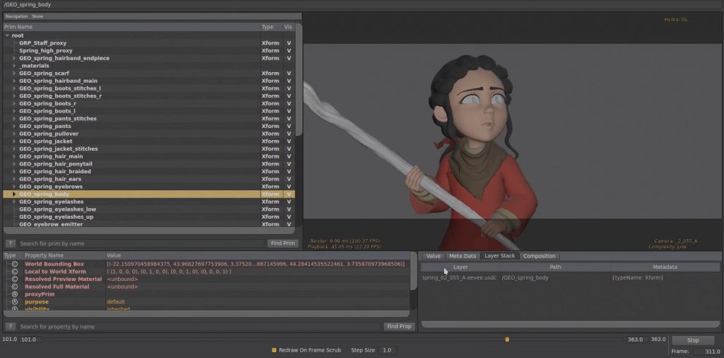 Spring asset được hiển thị trong trình xem USD (trình quản lý và liên kết dữ liệu mã nguồn mở được phát triển bởi Pixar).