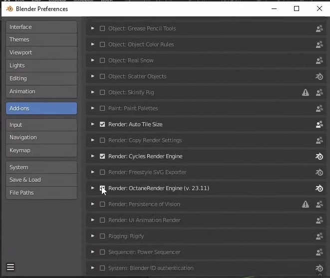 Bước 5) Sau khi cài đặt xong 2 file đó, chúng ta mở ứng dụng Blender để kiểm tra xem Octane Render Engine đã được kích hoạt chưa. Để thực hiện, bạn vào Edit > Preferences > Add-ons > Render: OctaneRender engine. Tích vào nếu nó chưa được kích hoạt.