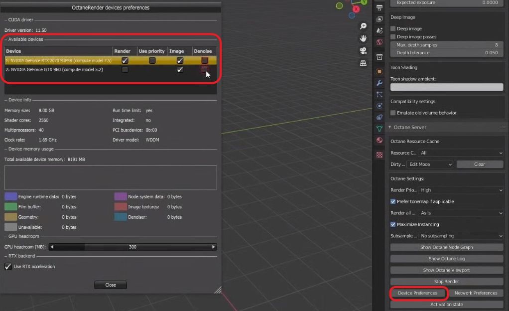 Vì bản Free Tier này chỉ có thể sử dụng 1 GPU, vì vậy nếu bạn có nhiều hơn một card đồ họa, bạn có thể chọn cái nào được gán dùng cho Octane bằng cách nhấp vào Device Preferences và tích vào GPU bạn muốn sử dụng.