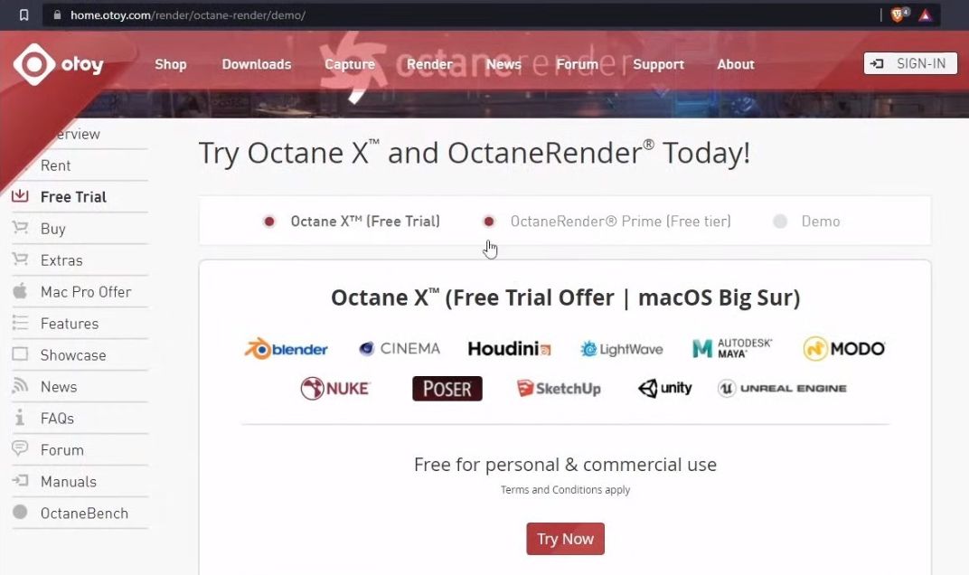 Để tải chúng xuống, bạn nên truy cập vào Shop > Free Trial > OctaneRender Prime (Free Tier) > Try now.