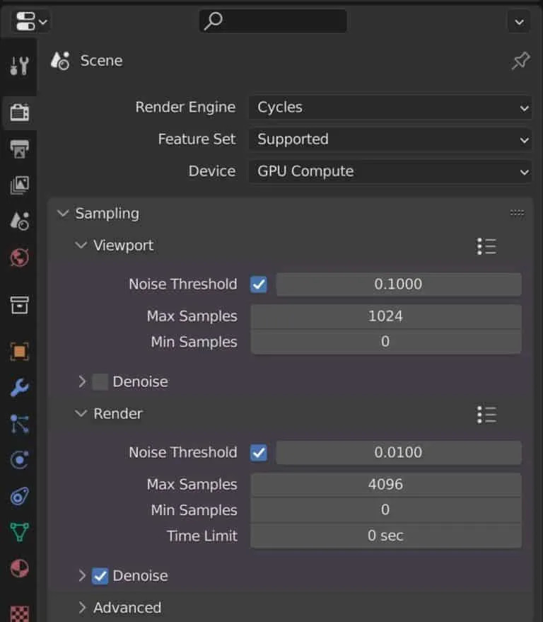 Nhưng thật không may, không phải ai cũng muốn thay đổi cảnh của mình. Nhưng ngoài các kỹ thuật đã được liệt kê ở trên, có nhiều cách khác để dễ kết xuất mà không tạo ra những thay đổi đáng kể. Đối với các hình ảnh đơn lẻ, hãy cân nhắc sử dụng số lượng sample thấp hơn khi hiển thị. Nếu bạn đang sử dụng công cụ kết xuất Cycles, số lượng mẫu sẽ xác định chất lượng cảnh của bạn. Số lượng mẫu bạn đang sử dụng càng cao, chất lượng cảnh của bạn càng cao. Đầu tiên, hãy thử với số lượng mẫu thấp hơn và sau đó kết xuất để xem liệu nó có mang lại cho bạn kết quả tương tự hay không. Nếu kết quả cuối cùng của bạn có nhiễu hạt, việc bật khử nhiễu hình ảnh từ cùng một menu thuộc tính sẽ giúp bạn loại bỏ mọi nhiễu trên mô hình của mình và duy trì độ chi tiết của cảnh.