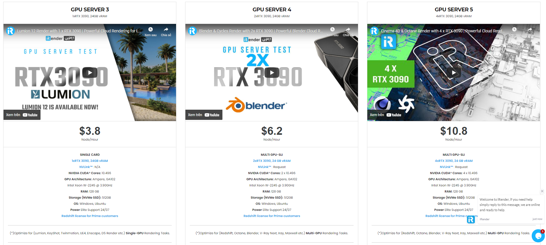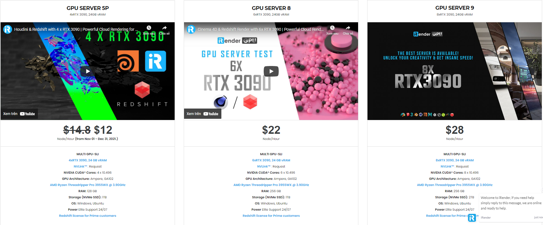 iRender cung cấp cấu hình cao cấp với mức giá hợp lý. Bạn có thể thấy rằng gói của iRender luôn có giá rẻ hơn nhiều so với các gói của các trang trại kết xuất khác (về tỷ lệ hiệu suất / giá cả). Hơn nữa, khách hàng của iRender sẽ được hưởng nhiều chương trình khuyến mãi và chiết khấu hấp dẫn. Ví dụ: tháng 12 này, chúng tôi đưa ra chương trình khuyến mãi cho người dùng mới và giảm giá cho nhiều máy chủ, người dùng sẽ tận dụng những điều này để tăng cấp cho kết xuất của họ. Ngoài ra khách hàng còn có thể tiết kiệm lên đến 20% khi thuê theo ngày/ tuần/ tháng.