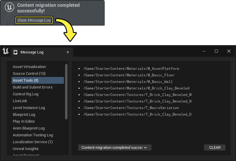 Sau khi quá trình di chuyển hoàn tất, bạn sẽ thấy hộp thoại xác nhận rằng tất cả asset đã được di chuyển. Chọn Show Message Log trong hộp thoại này để xem danh sách đầy đủ các asset đã được di chuyển thành công.