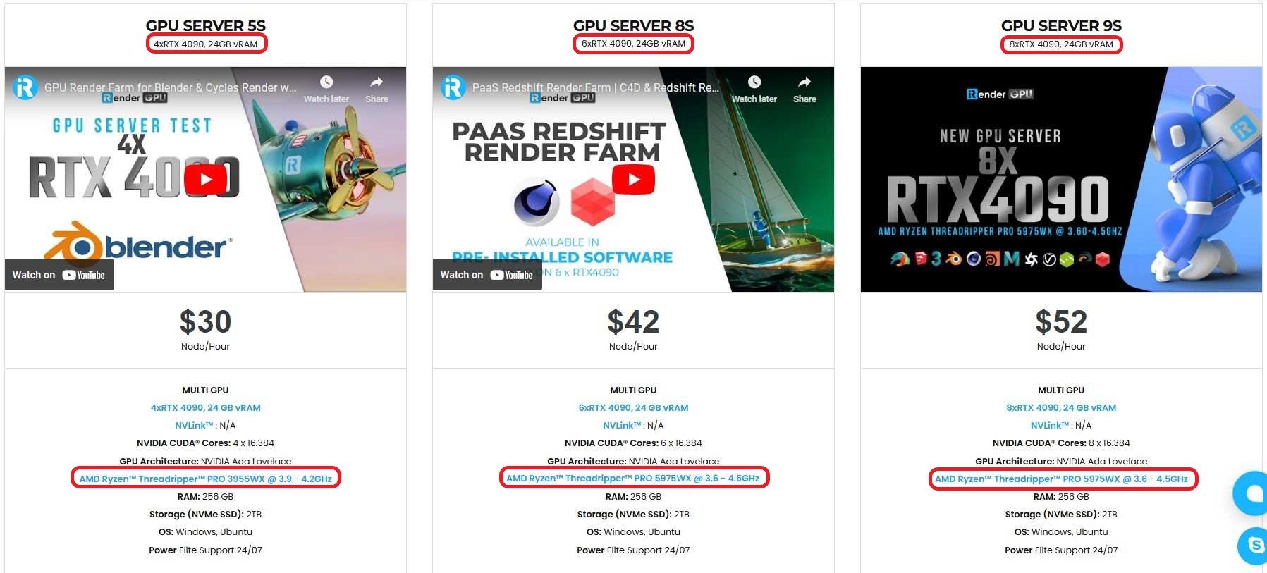 V-Ray có thể tận dụng sức mạnh kết xuất của GPU nên chúng tôi chọn cung cấp RTX 3090 và RTX 4090. Bạn có thể tham khảo các bài viết này để biết V-Ray hoạt động như thế nào trên các card đồ họa này, đặc biệt RTX 4090 là nhanh nhất khi nói đến kết xuất V-Ray.