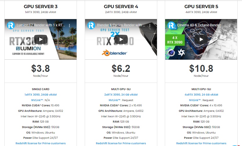 Tại đây chúng tôi cung cấp nhiều loại máy chủ đơn / đa GPU khác nhau, từ 1/2/4/6/8 RTX 3090. Những cấu hình máy high end và mạnh nhất, hiệu quả nhất để kết xuất Keyshot trong GPU, đi kèm với các thông số kỹ thuật sau: