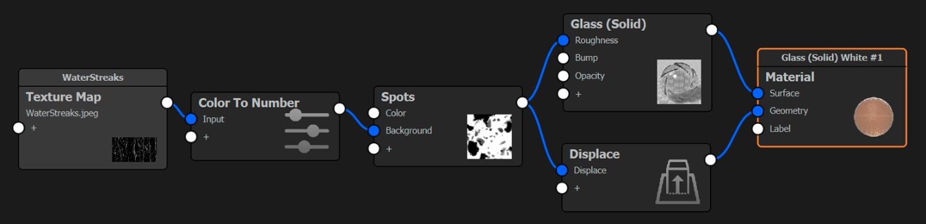 Tiếp theo, chúng ta sẽ thêm một nút dịch chuyển displacement node để nước sẽ được nâng lên khỏi bề mặt của chai. Nhấp chuột phải vào không gian làm việc của Material Graph và chọn Geometry, Displace. Kết nối nút Displace với đầu vào Hình học của nút Vật liệu chính , sau đó gắn nút Spots vào nút Displace. Điều chỉnh Displacement Height nếu cần thiết. Displacement Height phụ thuộc vào quy mô tổng thể của cảnh, vì vậy đừng sợ thử nghiệm. Sau đó, chọn nút Execute Geometry Node bên dưới Displace Properties hoặc chỉ cần nhấp vào biểu tượng Execute Geometry Node ở góc trên cùng bên phải của chế độ xem Thời gian thực. Lưu ý rằng hãy sử dụng một số âm cho Chiều cao dịch chuyển khi Màu của nút Spot và Màu nền được đảo ngược. Hãy cùng xem thiết lập Đồ thị vật liệu cuối cùng cho vật liệu Thủy tinh