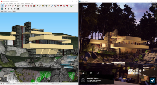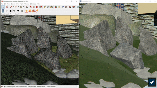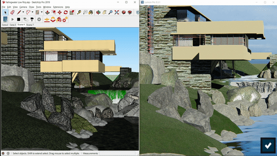 Khi xuất mô hình của bạn từ phần mềm tạo mô hình 3D, chẳng hạn như SketchUp (ở trên bên trái), việc giảm độ phức tạp của mô hình có thể cải thiện hiệu suất trong Lumion.