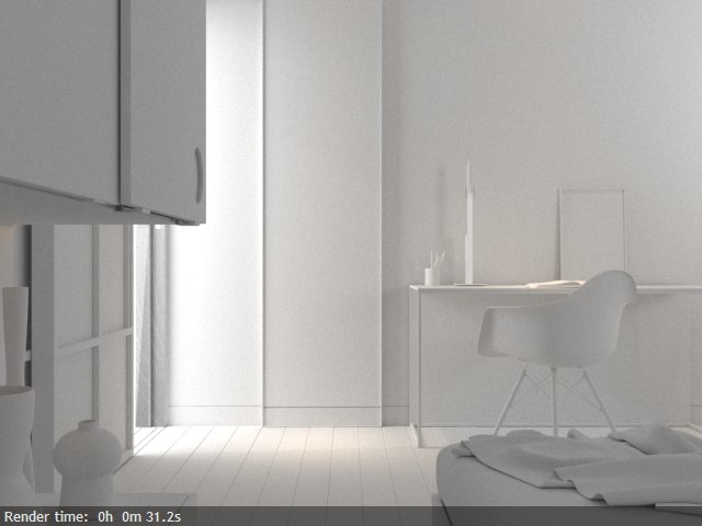 Thời gian kết xuất tăng lên vì V-Ray hiện đi qua từng vật liệu trong cảnh và lấy mẫu nó. Có một số nhiễu trong hình ảnh, nhưng nhìn chung kết quả là tốt.