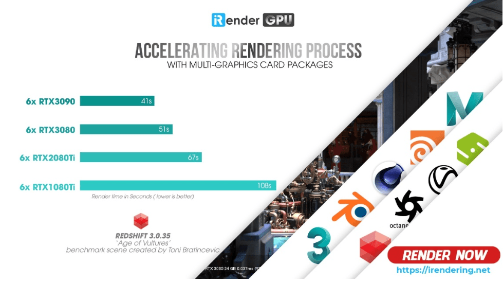 Dựa trên các thông số kỹ thuật được đề xuất ở trên, iRender cung cấp 3 gói dịch vụ bao gồm: 6 card GPU ( 6x GeForce RTX 2080 Ti / 6x RTX 3080 / 6x RTX 3090) hiệu quả nhất để render với Redshift với các thông số cấu hình sau: