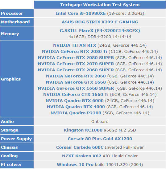Khi điểm chuẩn từ bên thử nghiệm được thực hiện cho bài viết này, trình điều khiển Quadro mới nhất đã được hai tháng tuổi, vì vậy họ đã cố gắng sử dụng trình điều khiển GeForce mới nhất trên toàn bảng. Điều quan trọng cần lưu ý là tất cả các trình điều khiển của NVIDIA đều giống nhau về hiệu quả; cài đặt GeForce 446.14 sẽ giống với cài đặt Quadro 446.14, nếu phiên bản trình điều khiển sau đó tồn tại. Ví dụ: cài đặt trình điều khiển GeForce trên cạc đồ họa Quadro sẽ vẫn cài đặt các tính năng tối ưu hóa và bổ sung cụ thể, như Quadro View (chính thức là nView).