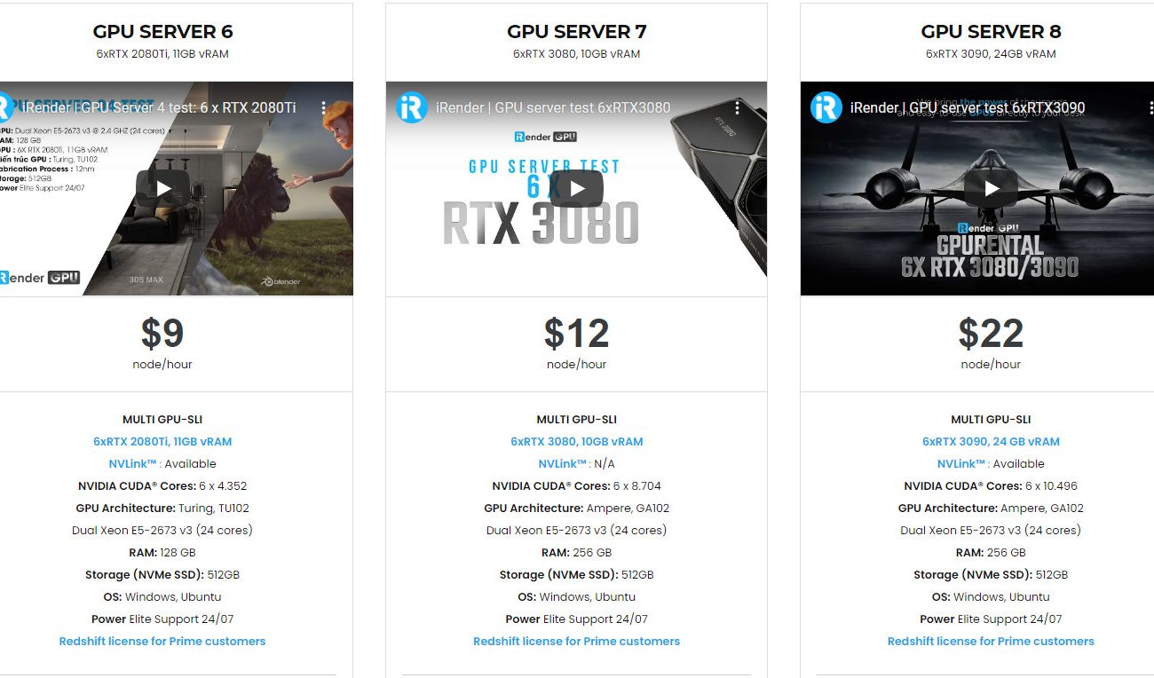Như bài viết bên trên, iRender cung cấp dàn server với cấu hình CPU mạnh mẽ, kết hợp card đồ họa (6x GeForce RTX 2080 Ti / 6x RTX 3080/ 6x RTX 3090), và thiết bị giúp gia tăng bộ nhớ – NVLink chắc chắn sẽ mang tới hiệu suất render vượt trội.