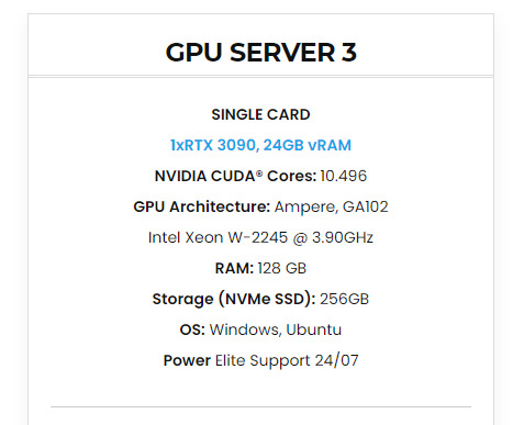 Chúng tôi hiểu rằng tốc độ xung có tác động lớn nhất đến hiệu suất của CPU với Octane. Đó là lý do chúng tôi cung cấp Bộ xử lý CPU Xeon W-2245 sở hữu tốc độ xung nhịp cao từ 3,9 GHz – 4,7 GHz và ổ SSD 512 GB để đặc biệt hỗ trợ các tác vụ đơn luồng. Server này cũng đi kèm với card NVIDIA RTX 3090 mới nhất được khuyến nghị cùng dung lượng VRAM lên đến 24GB .