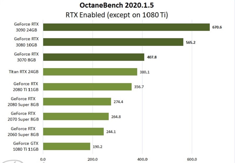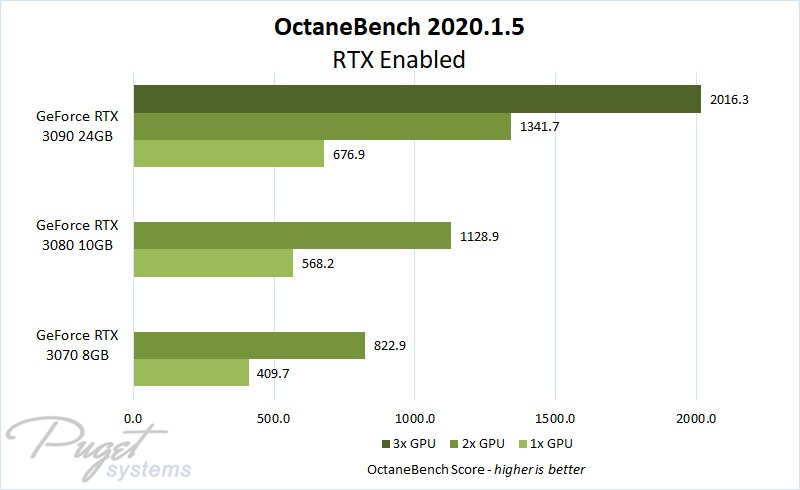 - GeForce RTX 3090 24GB – Đề xuất của chúng tôi dành cho hầu hết khách hàng render GPU, RTX 3090 cung cấp hiệu suất tốt nhất ở Octane đồng thời có bộ nhớ 24GB cực lớn. Nó cũng có sẵn với bộ làm mát kiểu quạt gió, cho phép sử dụng nhiều card nếu muốn.