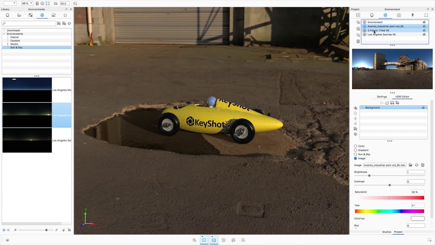 Có thể bạn đã quen thuộc với Keyshot Environments (Môi Trường Keyshot) – kéo và thả HDRI từ thư viện KeyShot để chiếu sáng tức thì cảnh trong thế giới thực. Trong KeyShot 7, chúng tôi mở rộng điều này với khả năng sử dụng nhiều môi trường trong một cảnh duy nhất. Trong cửa sổ Project, tab Environment, bạn sẽ thấy Environment List mới, nơi bạn có thể kéo và thả nhiều môi trường HDRI hoặc với KeyShot Pro, tạo và chỉnh sửa môi trường của riêng bạn bằng Trình Chỉnh Sửa HDRI. Hãy xem tính năng này và hai tính năng bổ sung mới khác cho môi trường.