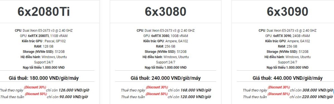 Chúng tôi cung cấp 4 loại server bao gồm server GPU đơn (1 RTX 3090 và CPU tốc độ xung nhịp cao), máy chủ GPU đôi (2 RTX 3090), server với 6 card GPU (6x GeForce RTX 2080 Ti/6x RTX 3080/6x RTX 3090) và CPU server phù hợp cho mọi nhu cầu của bạn: