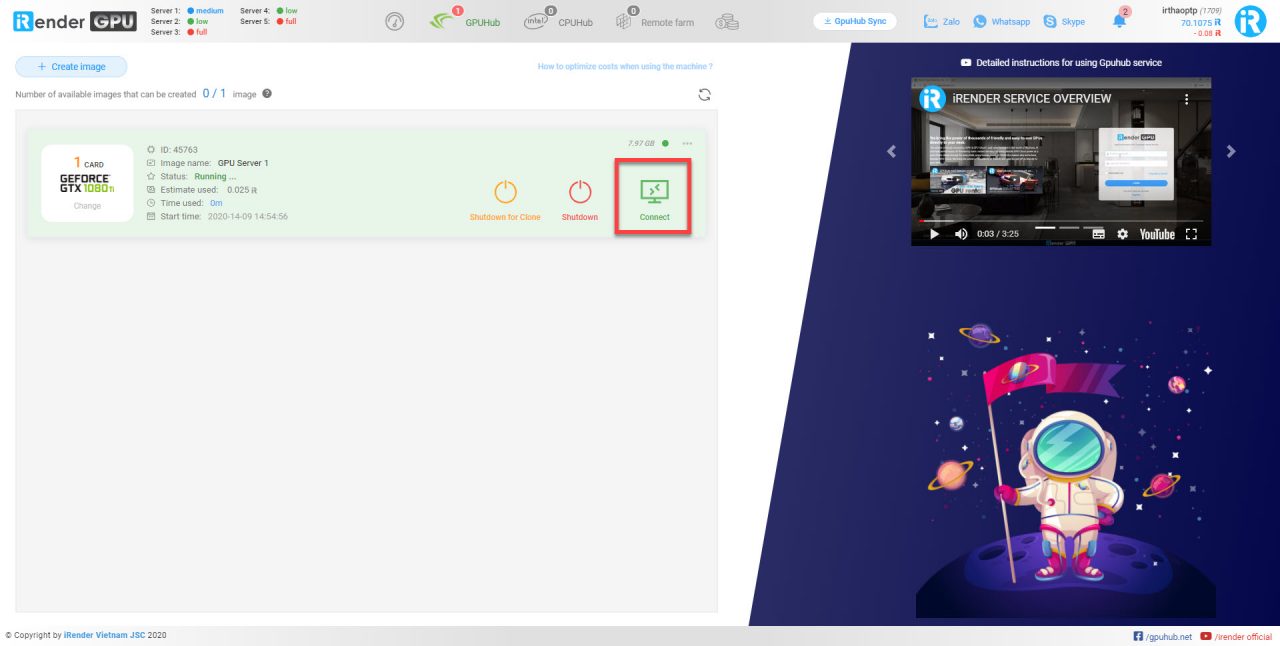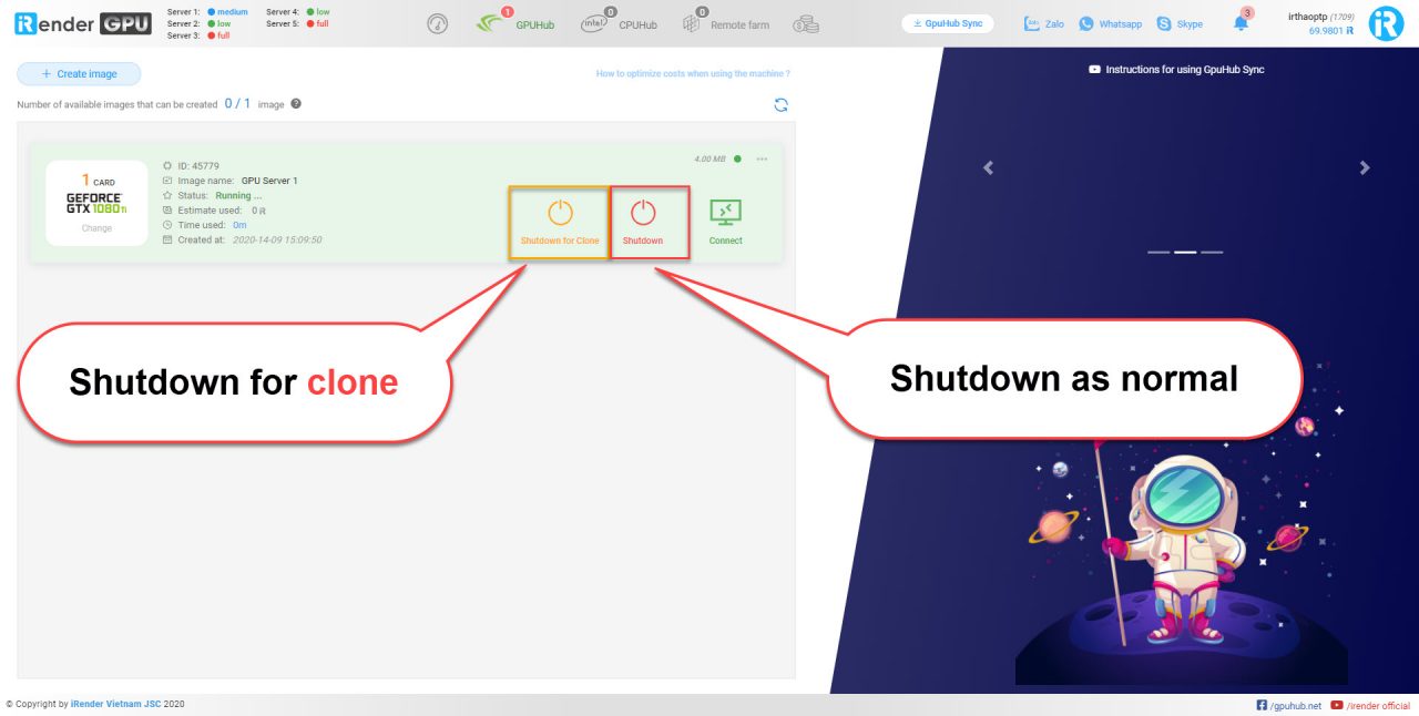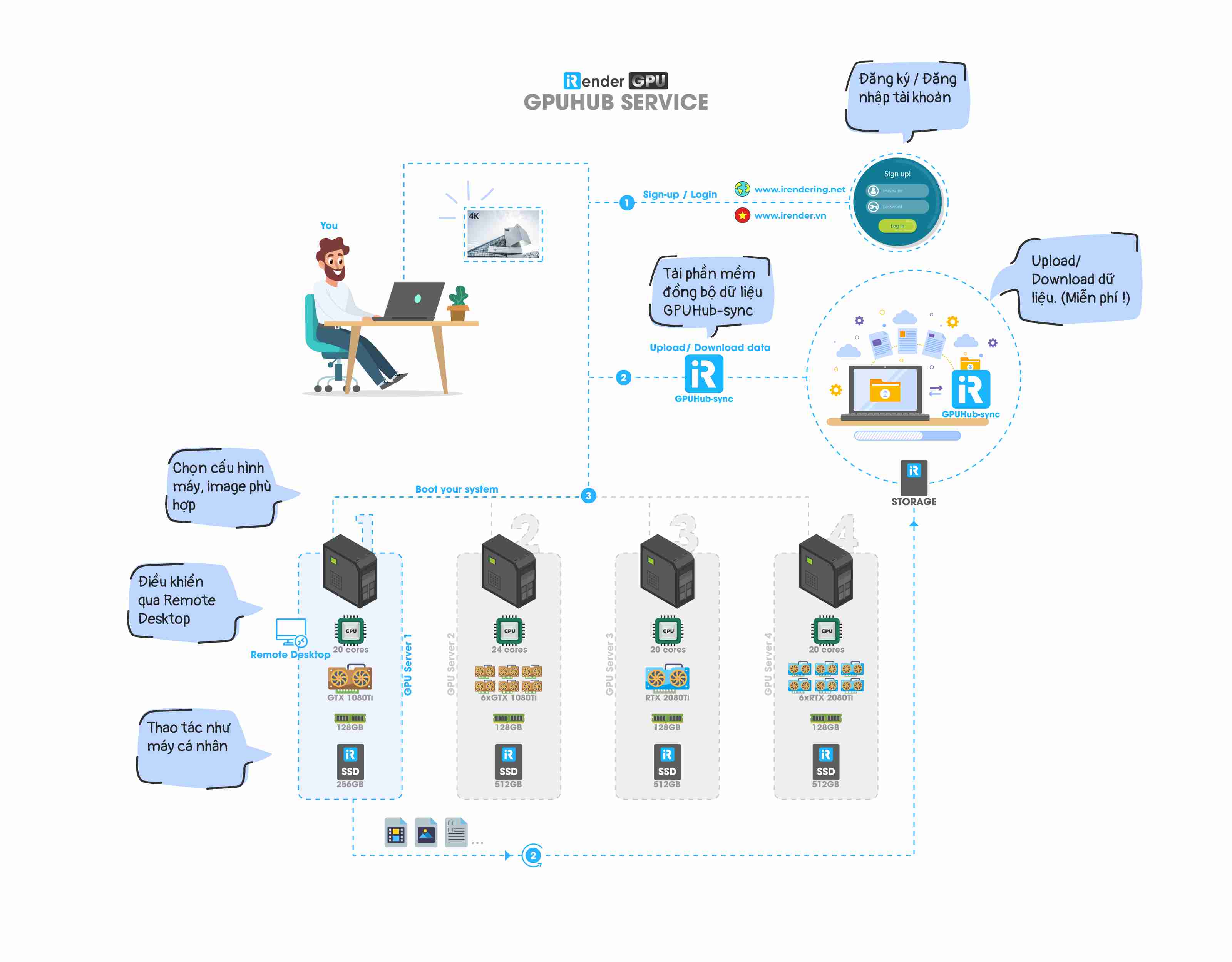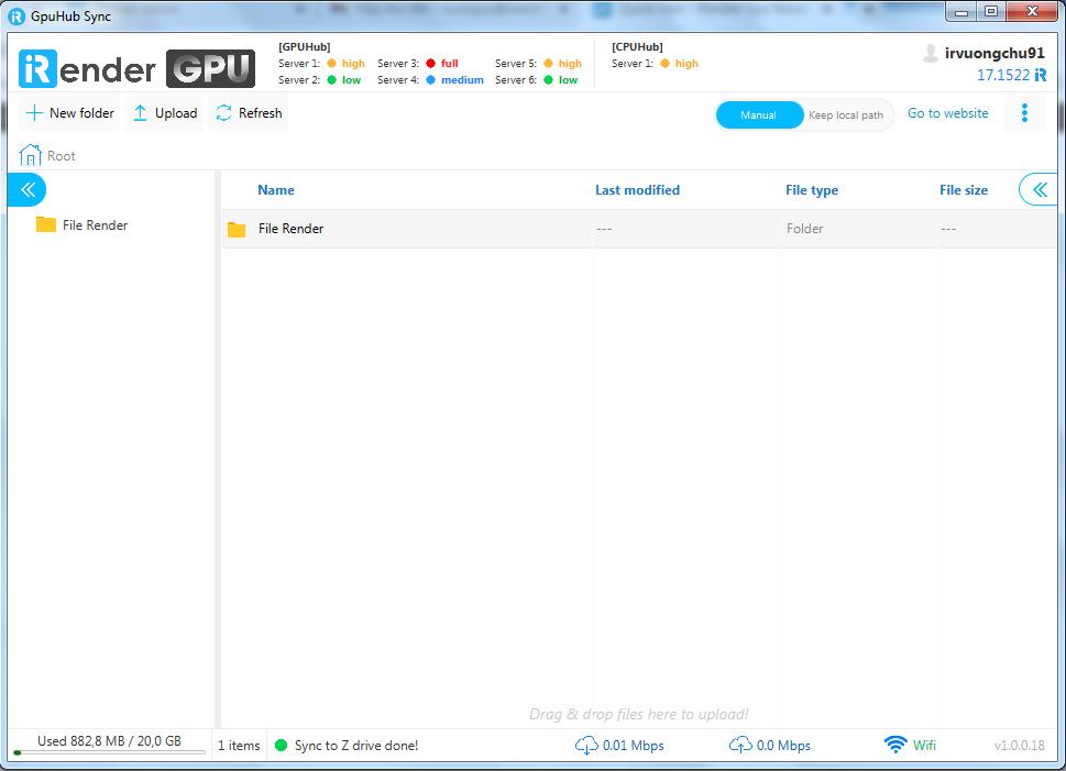 - Phần mềm truyền tải dữ liệu GPUhub Sync: Đây là một phần mềm được iRender thiết kế riêng cho người sử dụng dịch vụ với mục đích giảm thời gian chờ đợi khi phải truyền tải file giữa máy của người dùng lên hệ thống. Với tốc độ cao, dễ sử dụng và tính năng tốt, phần mềm này là một công cụ hữu hiệu cho khách hàng. Tìm hiểu thêm về GPUhub Sync tại đây.