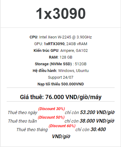 Với CPU Intel Xeon W-2245 mạnh mẽ và card đồ họa mạnh nhất hiện nay RTX 3090, khách hàng sẽ được trải nghiệm cấu hình nâng cấp chỉ với 76.000 VND/giờ/máy.