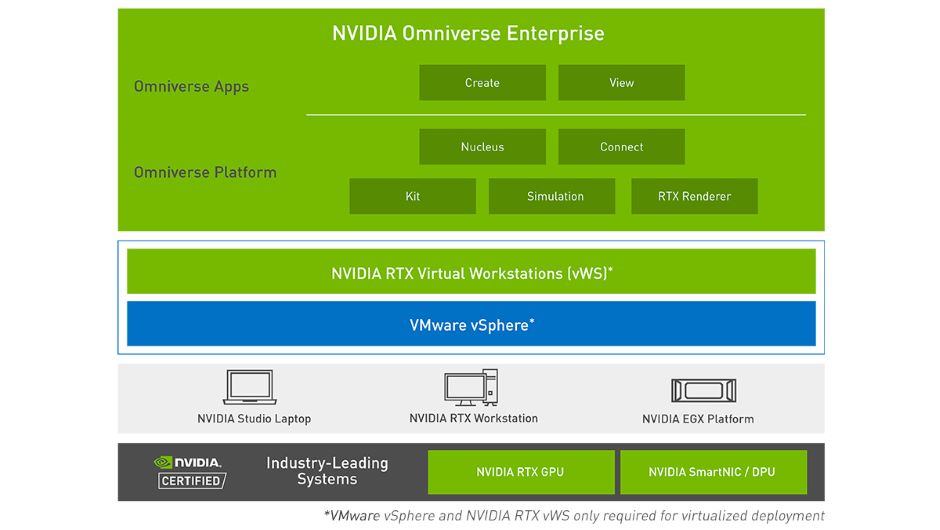 NVIDIA Omniverse Enterprise là một nền tảng mô phỏng và cộng tác end-to-end giúp biến đổi cơ bản các quy trình thiết kế phức tạp. Đăng ký nền tảng Omniverse Enterprise sẽ khả dụng sau khi chúng được xuất bản vào năm 2021 từ mạng đối tác toàn cầu của NVIDIA.
