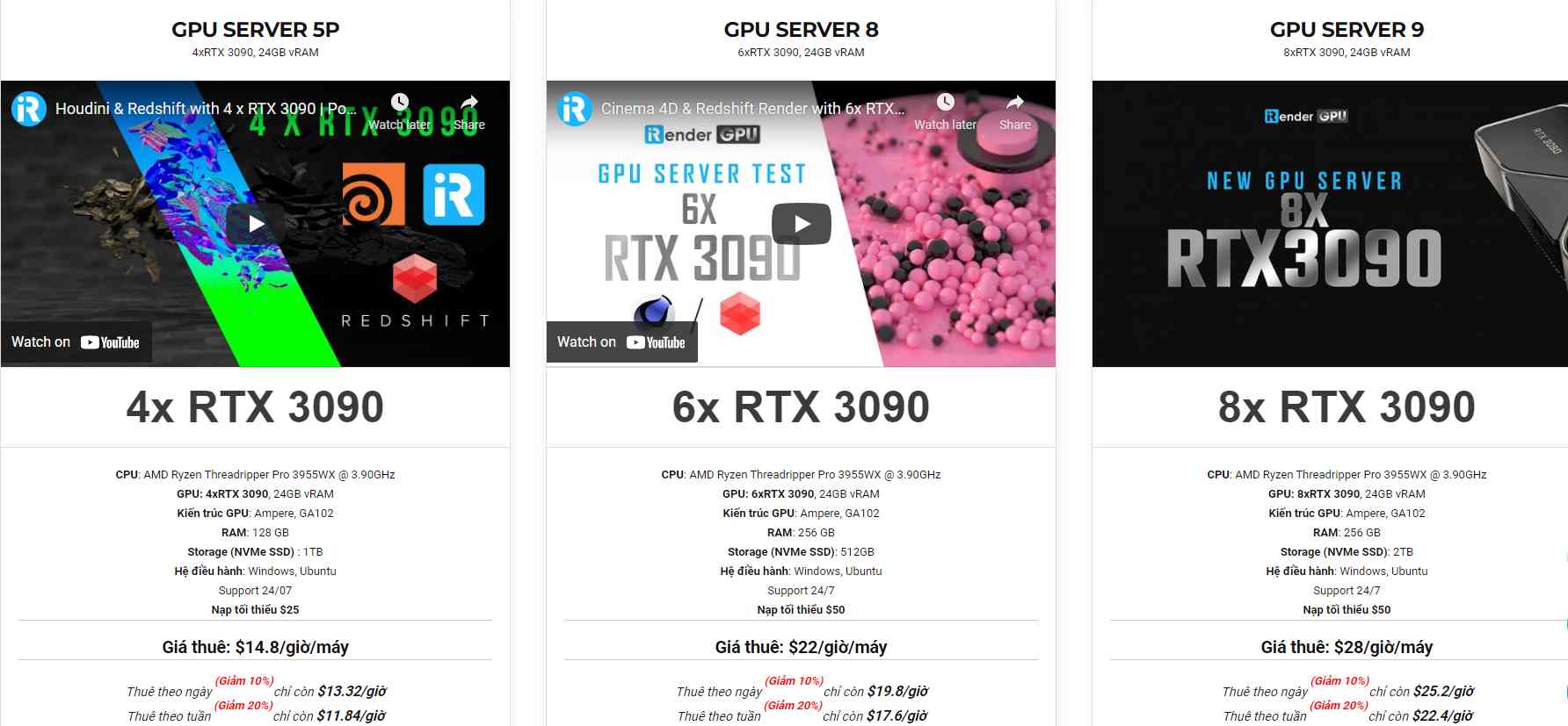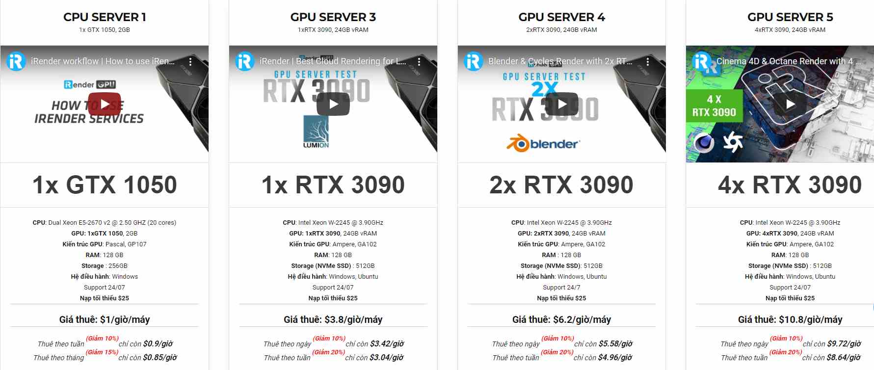 iRender cung cấp cấu hình high-end với mức giá hợp lý. Bạn có thể thấy rằng gói server của iRender luôn có giá rẻ hơn nhiều so với các gói của các render farm khác (trên tỷ lệ hiệu suất/giá cả). Hơn nữa, khách hàng của iRender sẽ được hưởng nhiều chương trình khuyến mãi và chiết khấu hấp dẫn. Đặc biệt, tính năng với tính năng fixed rental (tự động thuê dài hạn), khách hàng còn có thể tiết kiệm lên đến 20% khi thuê theo ngày/tuần/tháng.