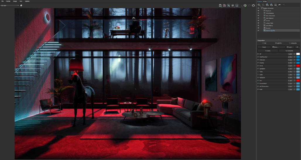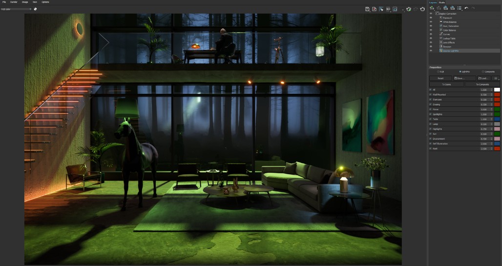 Lưu ý: Những thay đổi lớn trong Light Mix có thể tạo ra noise; nếu bạn nhận thấy noise hoặc artifacts từ các giá trị cao trong Light Mix, hãy nhấn nút “To Scene” – đặt tất cả các thay đổi đối với cường độ/màu sắc trở lại ánh sáng cảnh. Cần phải kết xuất lại để nhúng những thay đổi đó.