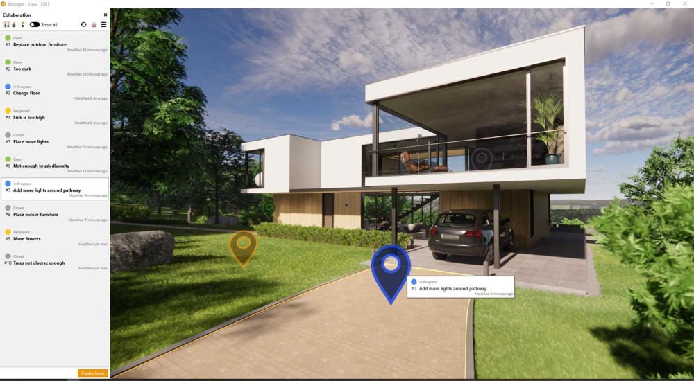 Tại Enscape, chúng tôi đã biến điều này thành hiện thực bằng cách thêm tính năng Collaborative Annotation. Nhận xét có thể được đính kèm trực tiếp vào vị trí có liên quan trong mô hình 3D, cho phép nhóm của bạn giữ được bối cảnh ban đầu và hiểu rõ yêu cầu khi trao đổi về các vấn đề thiết kế. Để tạo sự dễ dàng cho người dùng một cách tối đa, chúng tôi cũng đã làm cho Collaborative Annotation tương thích với BIM Track. Giờ đây, tất cả các vấn đề của project có thể được theo dõi ở một chỗ, cho phép bạn dễ dàng tập trung vào bất kỳ nhiệm vụ nào còn tồn đọng và tiếp tục tiến hành các project.