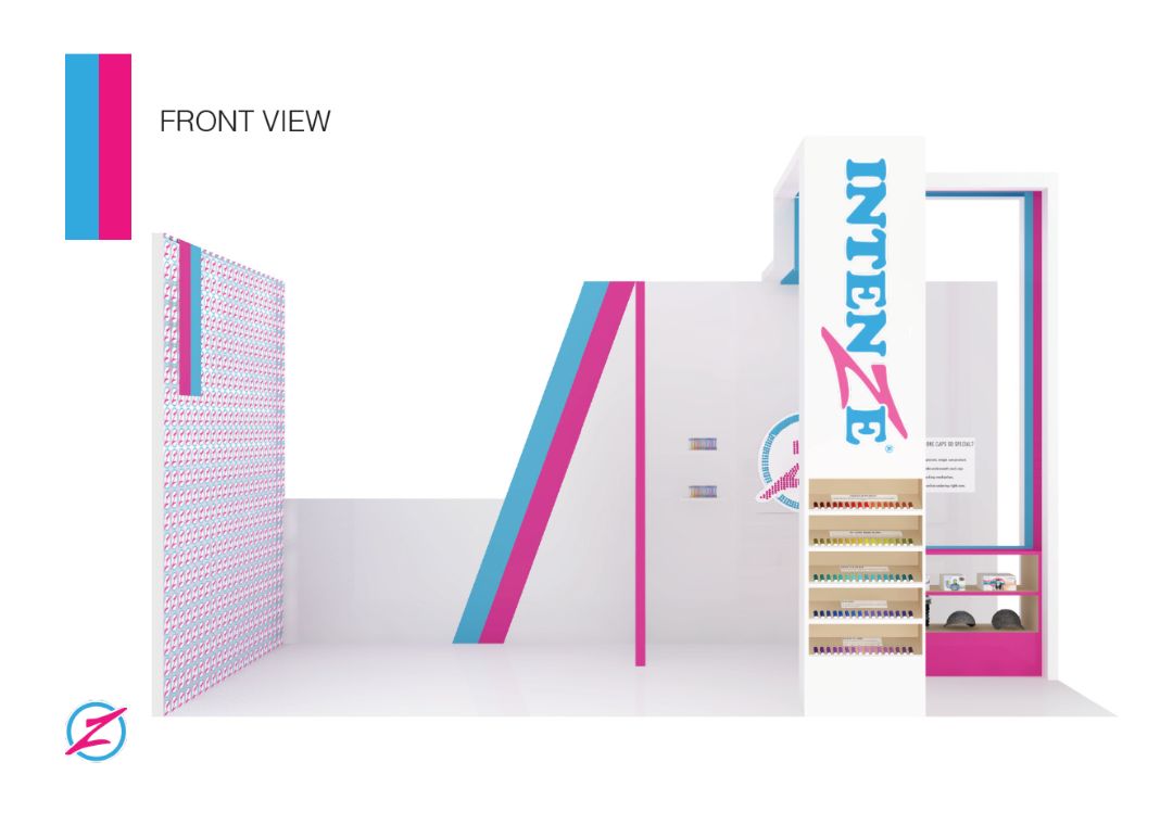 Năm nay, tôi có hai bài dự thi PAVE: một cho mùa xuân và một cho mùa thu. Đối với bài nộp PAVE mùa xuân của tôi, tôi đã làm việc với hai sinh viên khác: Johanna và Megan. Chúng tôi đã tạo một gian hàng triển lãm thương mại cho Intenze, một công ty mực xăm. Mục tiêu của thiết kế là tạo ra một gian hàng giáo dục người tiêu dùng về hàng hóa Intenze và triết lý của họ. Thiết kế này được lấy cảm hứng từ các hình thức góc cạnh và màu sắc của logo.