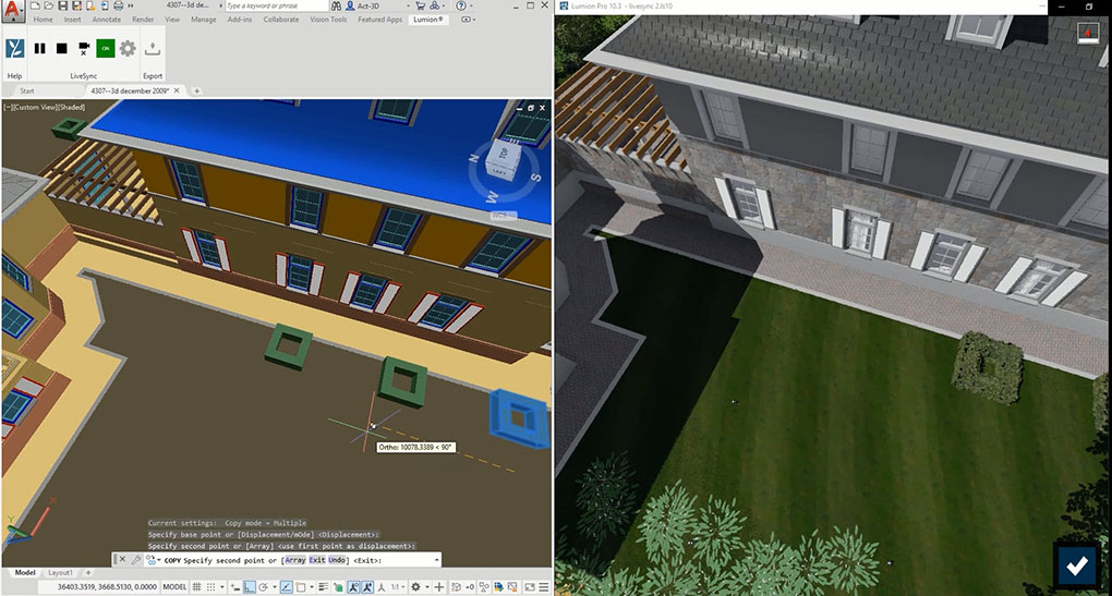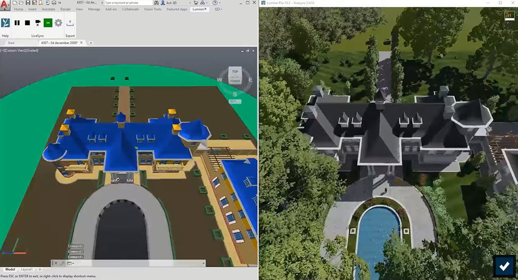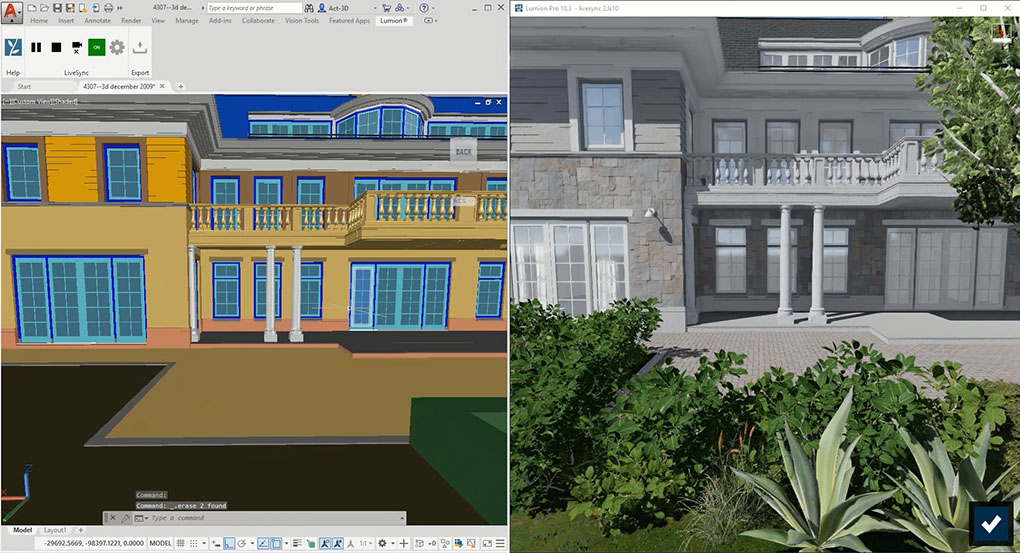 Khi bạn bật plugin LiveSync cho AutoCAD, bạn cũng có thể đồng bộ hóa chế độ xem camera giữa hai chương trình. Ngay lập tức, dự án Lumion của bạn sẽ hiển thị cùng một phối cảnh với dự án AutoCAD của bạn, giúp công việc của bạn dễ dàng hơn, nhanh hơn và thú vị hơn.