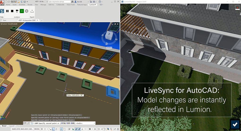 Lumion LiveSync là một tính năng kết nối hai ứng dụng phần mềm thiết yếu cần thiết để đạt được hình ảnh kiến trúc nhanh và hiệu quả: mô hình 3D và kết xuất 3D.