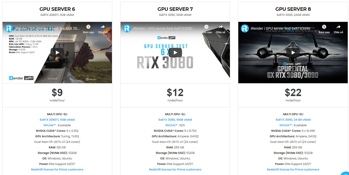 Dưới đây là thông số kỹ thuật của máy chủ mà iRender cung cấp cho kết xuất Octane & FStorm: