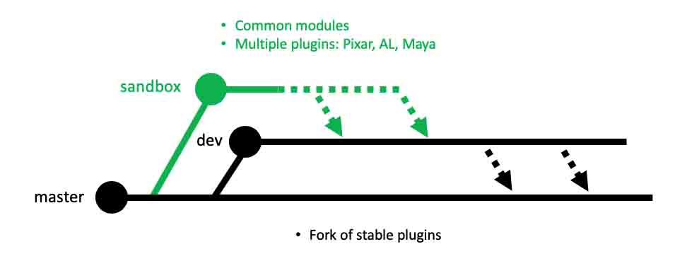 Nhánh sandbox chứa một framework chung về khái niệm cũng như hỗ trợ VP2 cho dữ liệu USD. Hiện nhánh sandbox đang trong quá trình sáp nhập vào nhánh Dev theo tính năng. Sau khi hoàn thành việc hợp nhất đó, sự phát triển trong tương lai sẽ diễn ra trong nhánh dev với các bản phát hành ổn định sẽ được hợp nhất trở lại trong máy chủ.