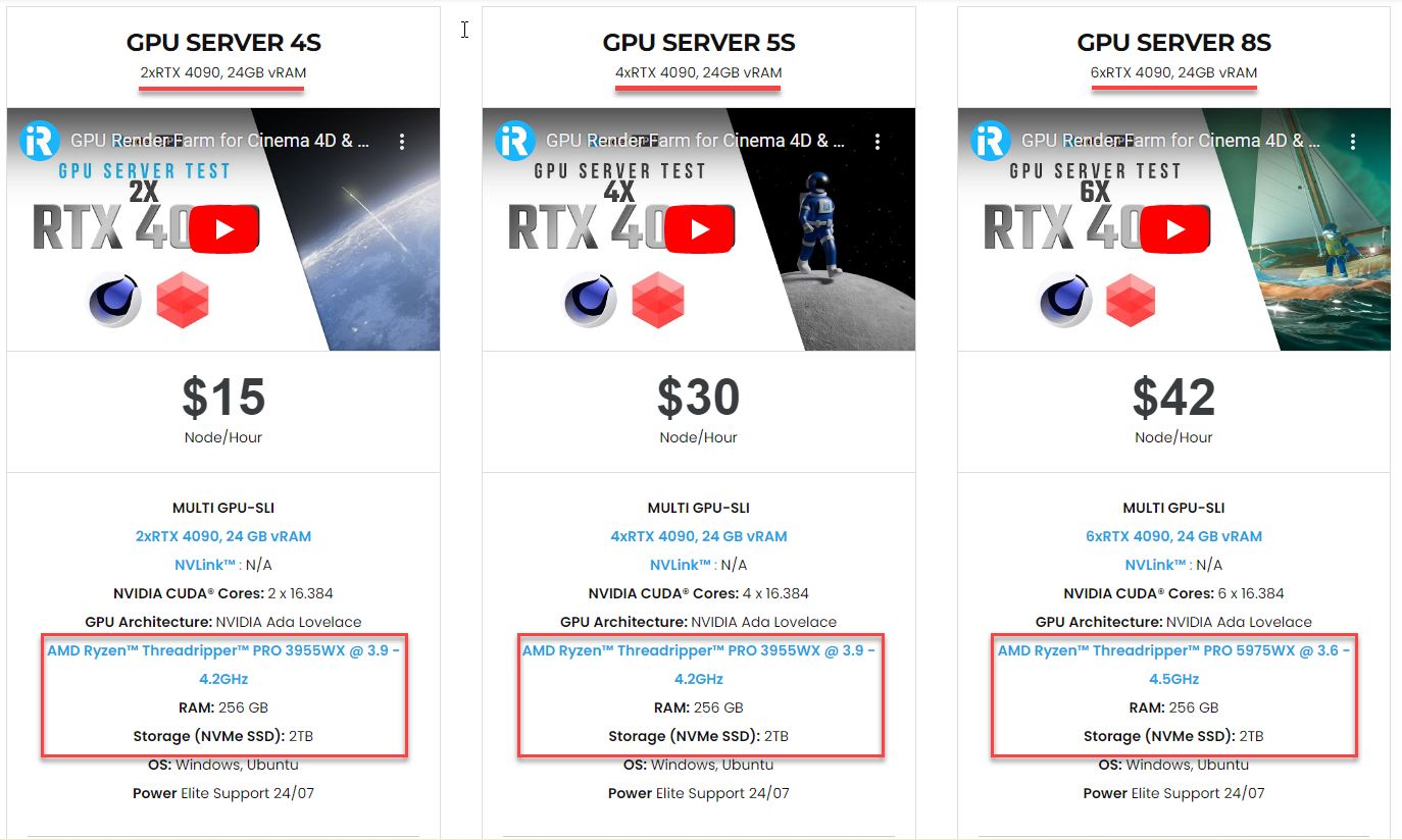 iRender cung cấp máy chủ (server) cấu hình cao, cụ thể là 1/2/4/6/8x RTX 4090 & RTX 3090. Với CPU mạnh mẽ cho Stable Diffusion là AMD Ryzen™ Threadripper™ PRO 3955WX @ 3.9 – 4.2GHz và AMD Ryzen™ Threadripper™ PRO 5975WX @ 3.6 – 4.5GHz, bộ nhớ RAM 256GB và dung lượng ổ cứng NVMe SSD 2T, tất cả các server của chúng tôi có thể giúp bạn xử lý các hình ảnh chất lượng cao trên Stable Diffusion một cách nhanh chóng.