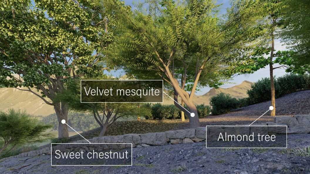 Ví dụ, đường lái xe vào nhà, chúng tôi đã trồng một vài cây hạnh nhân cao hơn ở phía sau, một hàng cây nhung để cung cấp một lớp màu xanh lá cây, bóng mờ sau bức tường đá của đường lái xe và một cây hạt dẻ ngọt ngào từ cây mỹ của bộ thư viện các vật liệu tự nhiên của Lumion 10.