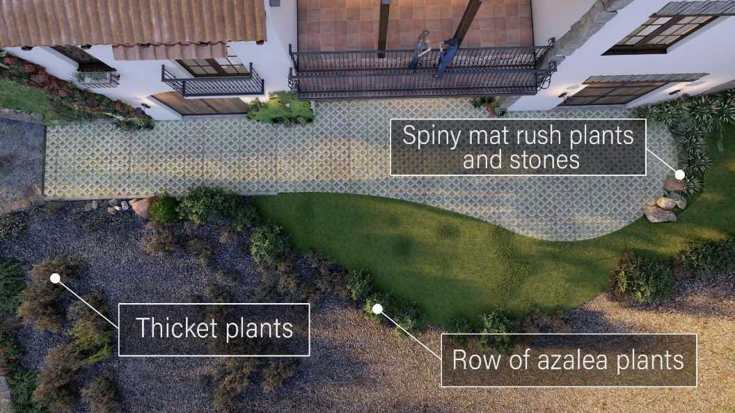 Ngoài cây xanh, chúng tôi cũng muốn nâng cao cảm giác của một môi trường sống tự nhiên bằng cách lấp đầy cảnh quan bằng một loại cây, bụi cây, hoa, đá và các vật thể cảnh quan khác.
