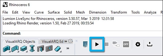 Bạn có thể bắt đầu đồng bộ hóa, kết nối mô hình Rhino của mình với môi trường Lumion 3D, bằng cách nhấn vào nút “Play” của plugin LiveSync. Chỉ sau vài giây, mô hình 3D của bạn sẽ được nhập vào Lumion.