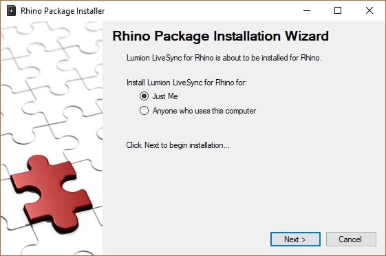 Một pop up sẽ hiện lên với nội dung “Rhino Package Installation Wizard”. Tại đây, bạn có thể chọn cài đặt plugin LiveSync for Rhino cho riêng bạn (dựa trên tài khoản và license Rhino cụ thể của bạn) hoặc cho bất kỳ ai sử dụng máy tính có cài đặt phần mềm Rhino và Lumion. Chọn tùy chọn phù hợp nhất với bạn và nhấn ‘Next’ để bắt đầu cài đặt.