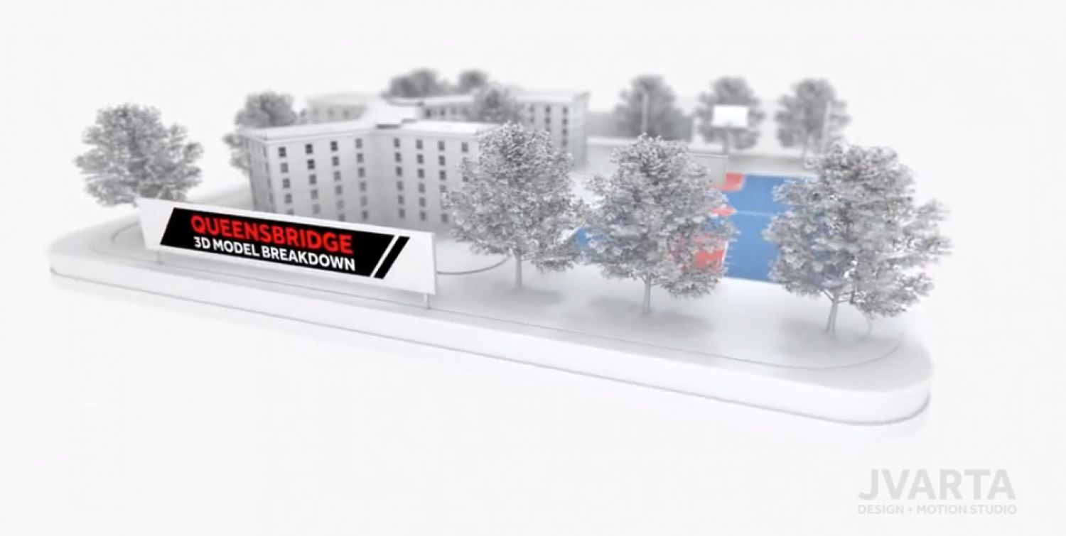 J.V.: Đội nhóm của họ đã quay rất nhiều cảnh quay trên đường phố và sử dụng máy bay không người lái. Chúng tôi đã tham khảo điều đó và Google Maps để đảm bảo rằng chúng tôi có tất cả các tòa nhà ở đúng chỗ của nó. Các dự án nhà ở của Queensbridge nằm trong một khu vực rất tập trung ở New York và các tòa nhà trông giống nhau. Để có được vẻ ngoài cách điệu mà chúng tôi muốn, chúng tôi đã sử dụng Cinama 4D để làm cho các tòa nhà từ đầu. Chúng tôi đã tạo ra ba phiên bản của các tòa nhà và chúng tôi đã nhân bản chúng và xoay chúng một cách chính xác. Có ba phần chính và thúc đẩy 30 tòa nhà khác chắc chắn đã giúp công việc của chúng tôi. Chúng tôi cũng đã sử dụng trình duyệt nội dung Cinema4D cho các đối tượng như cây cối.