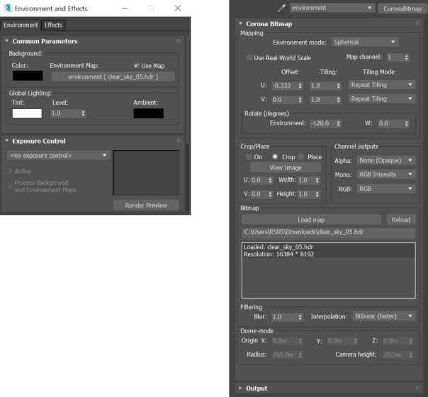 Ánh sáng được thiết lập là một HDRI với bầu trời rõ ràng và ánh sáng mặt trời rực rỡ để tạo ra bóng tối và độ tương phản mạnh. Không có đèn bổ sung đã được sử dụng trong cảnh này.